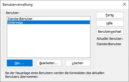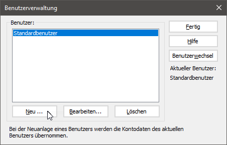 In der Maske Benutzerverwaltung sehen Sie den bisher einzigen Benutzer Standardbenutzer.