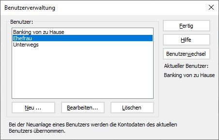 Der neue Benutzer ist zunächst als identische Kopie des Standardbenutzers angelegt worden. Das heißt, er verfügt über alle Banking-Kontakte mit den Zugangsparametern des Standardbenutzers.