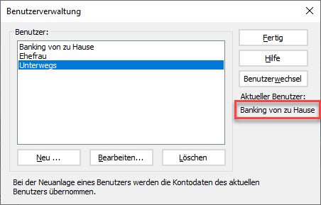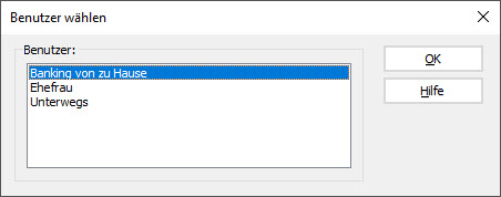 Wenn mindestens zwei Benutzer angelegt sind, erscheint beim Programmstart der Dialog Benutzer wählen: